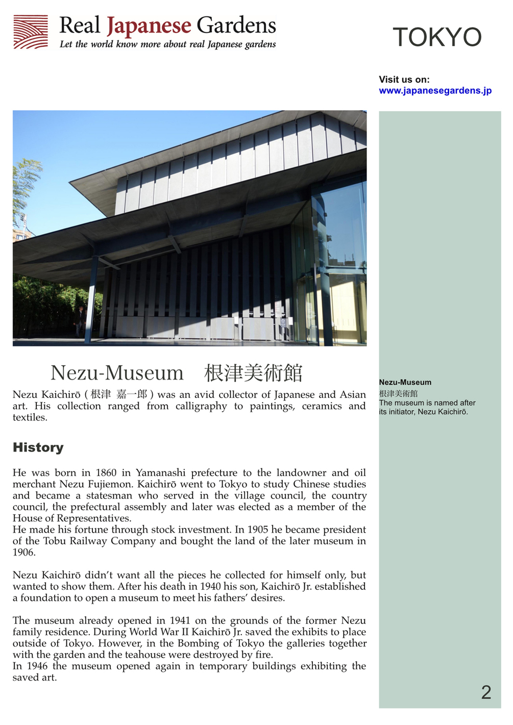 The Nezu is a private collection of Japanese and Asian art - from calligraphy to painting, ceramics and textiles. The industrialist and president of the Tobu railway company, Nezu was an avid art collector. The site of the museum and garden used to be his private residence, which he bought in 1906. After his death in 1940, his son founded the museum to preserve the collection. In World War , the museum and gardens were destroyed.
